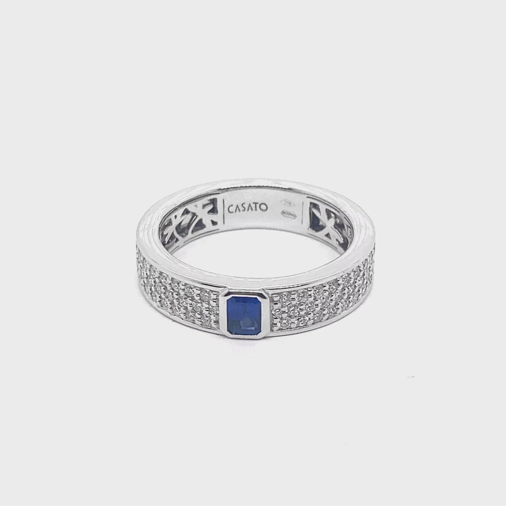 Anello in oro bianco 18kt firmato Casato impreziosito da una fascia di pavé di diamanti e da uno zaffiro blu centrale, che illumina il design con un’eleganza decisa e raffinata.