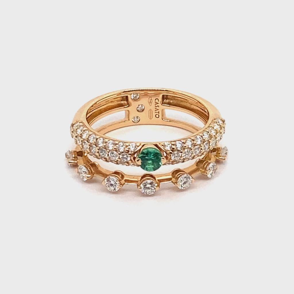 The Maureen Medine ring stands out for its unique design. The upper part is illuminated by a pavé of diamonds with an emerald at the centre that stands out with its deep and regal intensity. The lower part is punctuated by single diamonds set as if suspended, adding dynamism and lightness to the composition. The mastery of Casato's goldsmiths is reflected in every detail, from the perfect setting to the architectural precision of the design. The ring is made of 18-carat rose gold and is designed for those seeking elegance, character and originality, to be worn every day as a distinctive sign of style.
