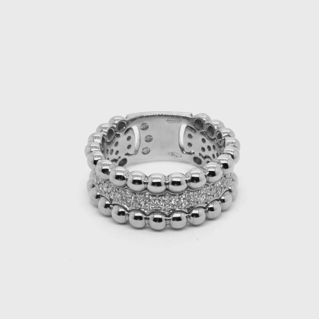 L'anello Boutique Icon si contraddistingue per il design originale: una fascia centrale con pavé delimitata da elementi sferici, segno distintivo dell collezione. Il gioiello, realizzato in oro bianco 18kt, rappresenta l'essenza della modernità firmata Casato offrendo un'estetica raffinata e contemporanea.