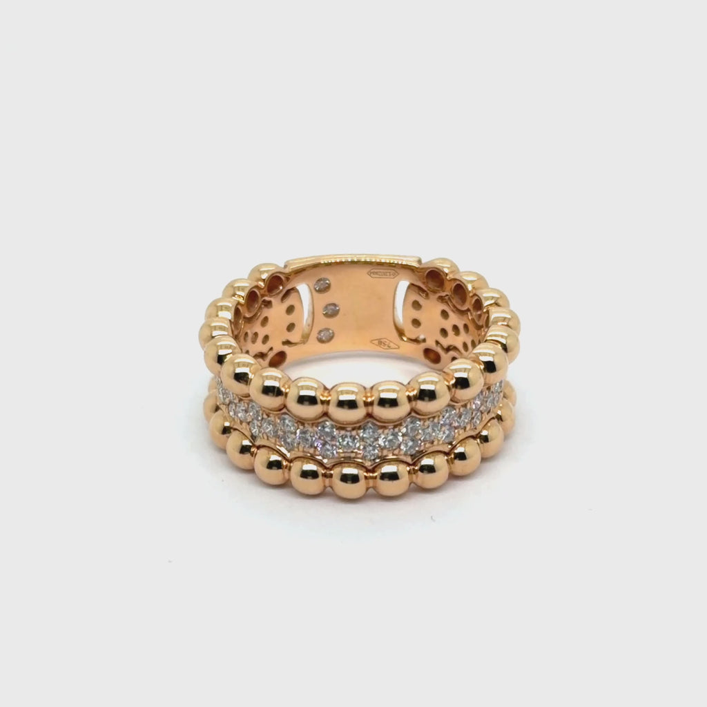 L'anello Boutique Icon si contraddistingue per il design originale: una fascia centrale con pavé delimitata da elementi sferici, segno distintivo dell collezione. Il gioiello, realizzato in oro rosa 18kt, rappresenta l'essenza della modernità firmata Casato offrendo un'estetica raffinata e contemporanea.
